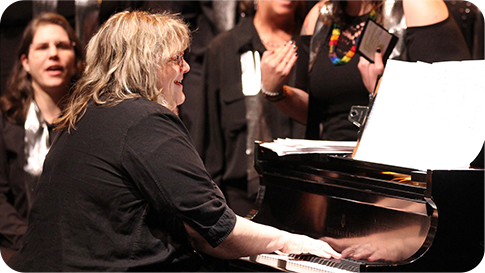 Soromundi began with 6 women in 1989 who met in the living room of its founder, Karm Hagedorn. The following year Lisa Hellemn joined as the accompanist and became director in 1993. Lisa and Karm shared the director role from 1998 to 2017 when Karm retired. In the early years, some women participated in rehearsals but didn’t sing publicly or list their full names in programs for fear of losing their jobs. The chorus quickly emerged as a politically active group in response to local, state, and national anti-LGBTQ measures and performed at rallies, marches, and vigils.