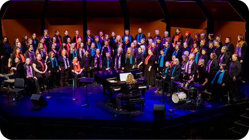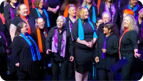 Soromundi Lesbian Chorus isn’t just lesbians. We are nearly 100 voices strong, and our membership represents the entire queer spectrum along with straight allies. Our youngest member is 23 and our oldest alumni member is 91. Each September we welcome anyone who identifies as female or nonbinary, regardless of singing experience or musical ability. The songs we sing are a reflection of who we are, and 80% of the music is chosen by the membership. Thus, our music is as diverse as our membership, and our concerts are a patchwork of traditional choral works, along with pop, folk, and international tunes. Chorus members are known as “Mundis,” and while performance remains our primary objective, activism is at the heart of what we do. We can be found at marches, vigils, and celebratory events. When others can’t use their voices, we sing for them. We collaborate with other choruses and groups, and we engage with and support other community organizations. Perhaps our greatest strength is our commitment to each other and the Mundi community, as we treasure the opportunity to lift our voices together and build friendships that last a lifetime.